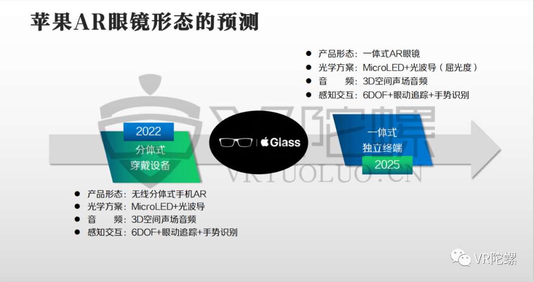 在演讲中,案山子对苹果AR眼镜形态发展作出了个人的分析:产品形态为以MicroLED+光波导为光学方案,加以3D空间声场音频和6DOF+眼动追踪的无线分体式手机AR;当MicroLED及全息显示成熟之后,未来,手势识别将加入感知互动方式中,产品形态主要为一体式AR眼镜。