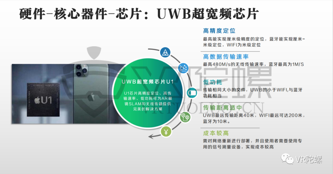 另一个核心芯片包含了UWB超宽频芯片,这是一个无线传输技术,从A11开始采用。与蓝牙相比,传输速度快了几百倍(蓝牙只能1m/s)。高效传播速率、高精度定位、传输距离适中、低能耗是UWB超宽频芯片的优势,但使用者需对网络重新进行部署,并且需要使用专用的信号测量设备,劣势在于实现成本较高。