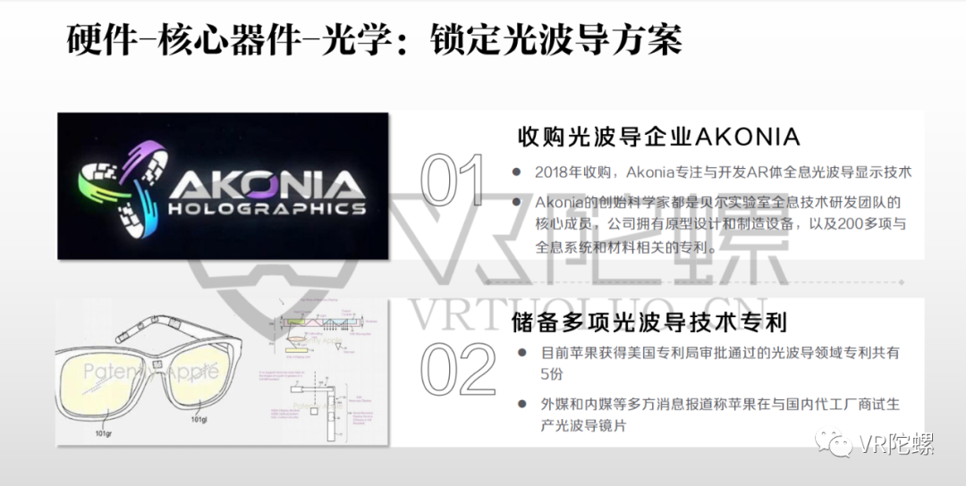 2018年收购的光波导企业AKONIA,是苹果在全息光波导上布局的一个重要企业。AKONIA的创始科学家都是贝尔实验室全息技术研发团队的核心成员,公司拥有原型设计和制造设备,以及200多项与全息系统和材料相关的专利。目前苹果获得美国专利局审批通过的光波导领域专利共有 5份;外媒和内媒等多方消息报道称苹果在与国内代工厂商试生产光波导镜片等。虽然专利很多,但并不能代表苹果完全生产出来,只能说明未来的技术路径将会沿着这个方向走。