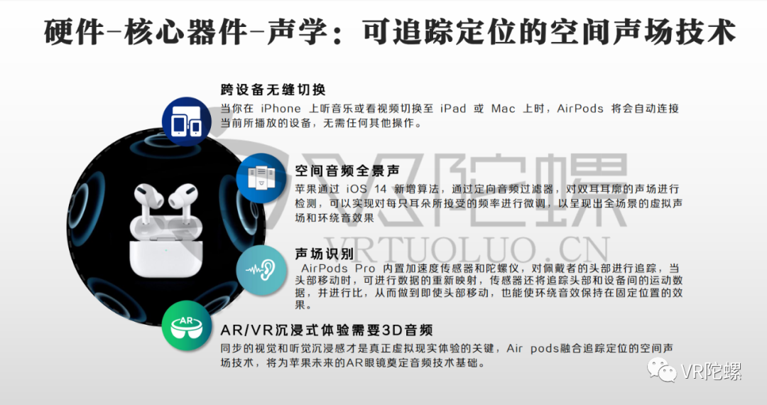 在声学布局上,同步的视觉和听觉沉浸感是真正实现虚拟现实体验的关键。苹果的全景声效果采用了可追踪定位的空间声场技术,其Air pods产品融合追踪定位的空间声场技术,将为苹果未来的AR眼镜奠定音频技术基础,以保证全沉浸,并能够跨设备无缝切换,实现空间音频全景声效果。其中的技术复杂度完全不亚于一台iPhone手机。