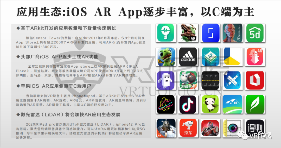 目前还没有ios AR app最新的数据。从这几年来看,App store的AR应用的量并不大,相比传统手游,有一定局限性,但最火的AR app《Pokémon GO》全球销量达30亿美元。陆续出现的Niantic大规模的融资、哈利波特IP的AR游戏、任天堂的马里奥AR,说明在赛道上的大家还蛮有兴趣的。除此之外,苹果在传统游戏市场的关注度增高,内容产品主要针对C端市场。