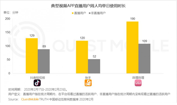 直播对于提升用户粘性作用巨大,Questmobile在3月发布的《2020年中国移动互联网“战疫”专题报告》中指出,典型平台直播用户对平台的周人均单日使用时长都超过120分钟,远高于非直播用户。