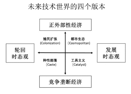 在这两股驱动力量不同方向发展的影响下,我们看到未来技术世界可能有四个不同的版本。依照情境规划的习惯,我们赋予各个版本生动的名称,以激发文学式的想象。