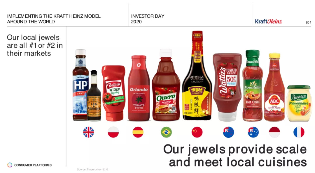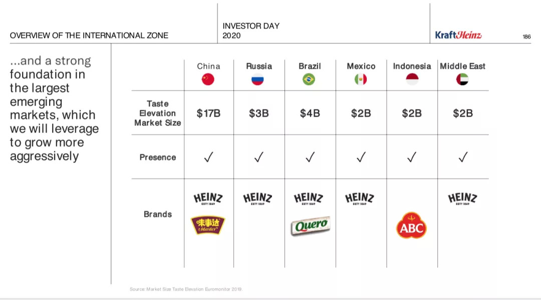 目前,卡夫亨氏在北美市场以外的国际业务规模超过50亿美元,EBITDA接近20%。在国际业务中,60%的销售额来自发达市场,40%来自新兴市场。