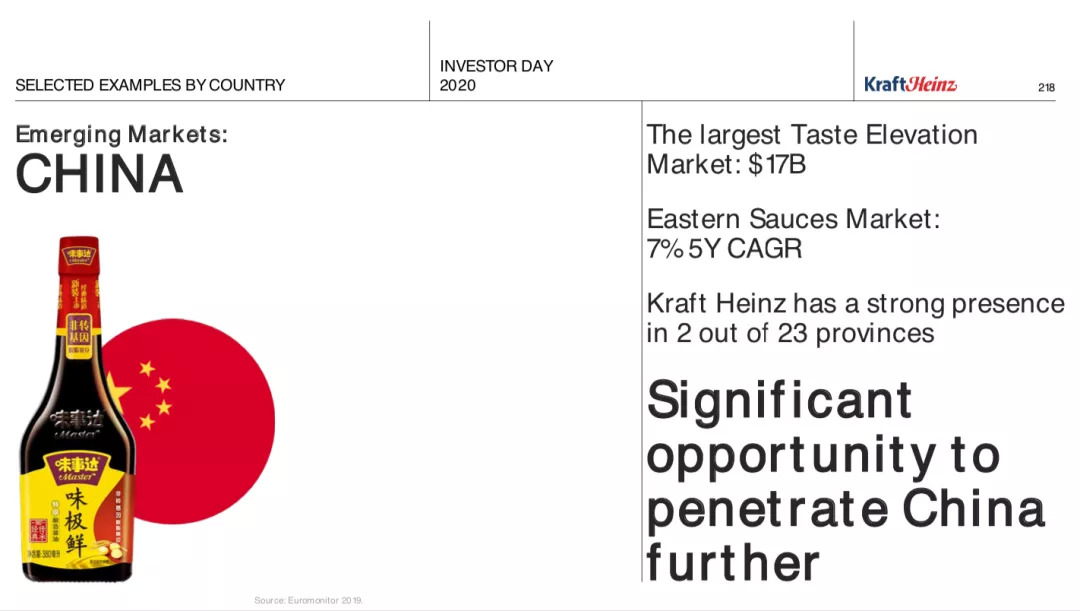 “我们身处的品类和市场在全球范围内正在增长,从酱汁、肉类和奶酪、餐食,到咖啡、饮料和坚果,它们在新兴市场的增长速度甚至更快,而新兴市场的销售额仅占我们的10%左右。新兴市场(如中国)有很大的机会可以加速增长。我们已经开始着手去做了(详见下文)。”他说。