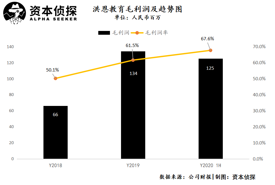 具体来看,2018年、2019年和2020年上半年洪恩教育的毛利分别为6601万元、1.35亿元和1.25亿元人民币。报告期内毛利率呈稳步上升趋势:2018年、2019年和2020年上半年毛利率分别为50.1%、61.5%、67.6%。