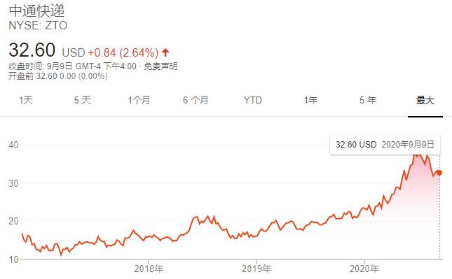 中通快递是2016年10月在纽交易所挂牌上市的,当时融资规模14.5亿美元。上市后,公司股价一度破发,但随后股价和市值持续回升,到今年8月底,股价已经超过33美元,市值达到263亿美元(近2000亿港币)。