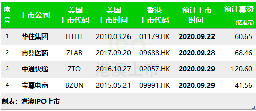 9月17日消息,瑞恩资本统计的数据显示,截至目前,华住集团、中通快递、再鼎医药、宝尊电商四家公司已通过聆讯,正准备开始招股,拟募资最多或达291亿港元。