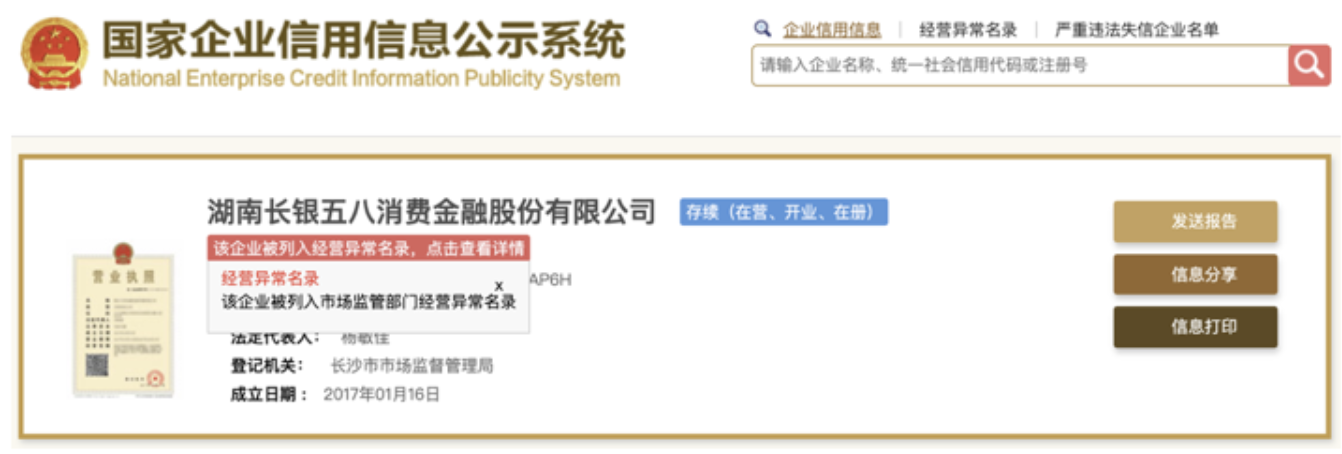 据国家企业信用信息公示系统,湖南长银五八消费金融股份有限公司(下称“长银五八消费金融”)日前因通过登记的住所或者经营场所无法联系,被长沙市市场监督管理局列入经营异常名录。长银五八消费金融客服对蓝鲸财经表示,其公司目前正常运营。