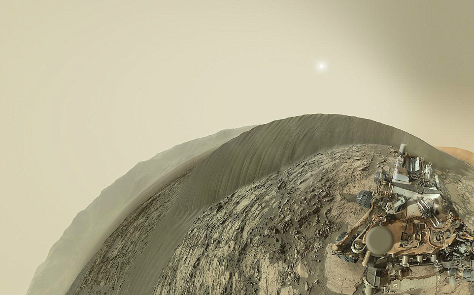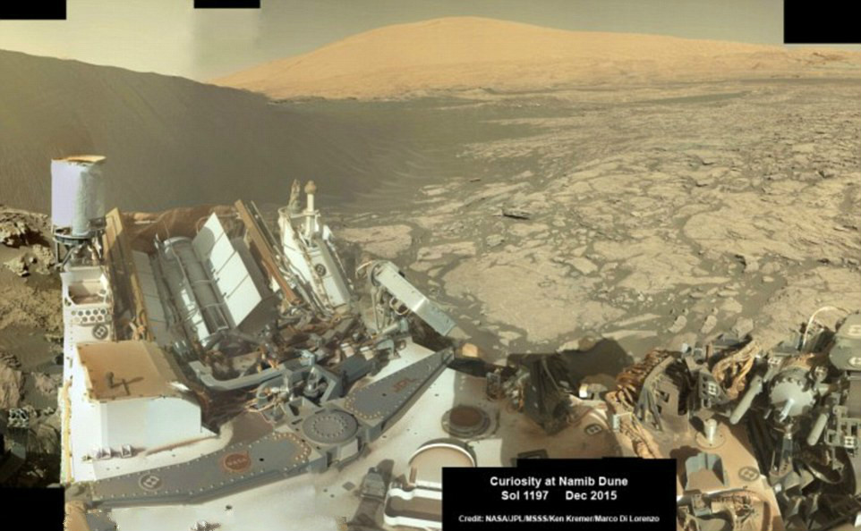 “好奇号”到达沙尘活动活跃的Namib沙丘背风一侧后,科学家们想让“好奇号”用甲板上的相机自拍一张,看看“好奇号”身上落了多少沙尘。