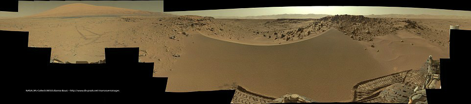 “好奇号”于本月早些时候到达Namib沙丘附近,这里遍布深色沙尘,犹如汪洋大海一般,属于Bagnold沙丘群的一部分。