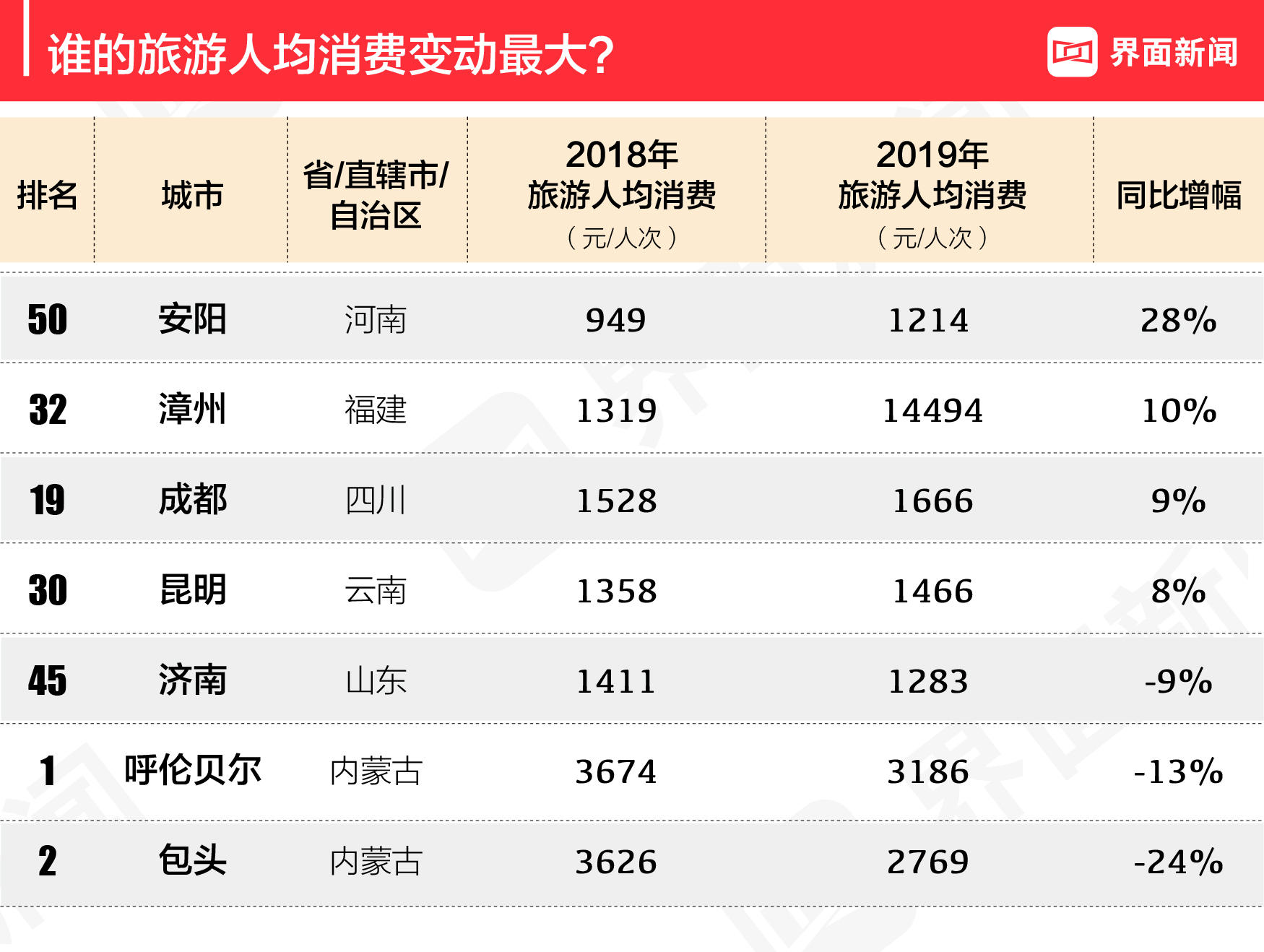 从旅游人均消费增幅来看,安阳变动最大,上升了28%,达到1214元并入榜。河南安阳的旅游资源以自然风光和人文景观为主,如太行大峡谷、桃花谷,以及商代古都殷墟、著名人工水利工程红旗渠等。包头和呼伦贝尔的旅游人均消费分别大幅下降了24%、13%,但并没有影响到它们的名次。