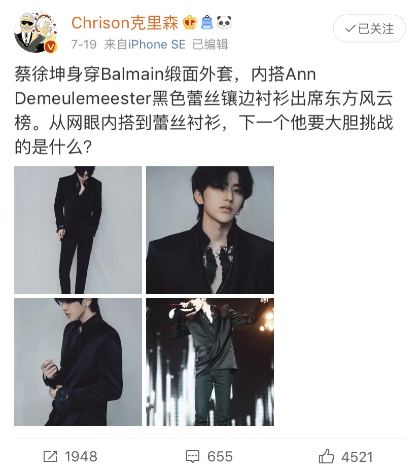 最近几年,明星出席活动或有工作行程时总会分享造型穿搭,这在某种程度上促进了小众设计师品牌走进大众视野。Ann Demeulemeester是最近几年不少男艺人上台演出或私下出行时的选择,蔡徐坤、吴亦凡、易烊千玺等都曾多次穿着Ann Demeulemeester在公众面前亮相,让部分曾经不了解Ann Demeulemeester的人群认识了这个品牌。