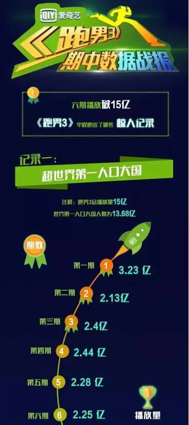 以《跑男3》为例:作为独家网络播出平台,凭借日均10多亿VV的强大流量优势,爱奇艺在《跑男3》开播前后都投入了大量的资源进行推广,全面覆盖自有媒体、户外媒体、站外线上资源、线下活动等系列整合资源,系统化助推节目品牌和流量的提升。从而使得《跑男3》在众多新老综艺节目夹击下,依然独居综艺节目鳌头,成为当之无愧的综艺冠军。
