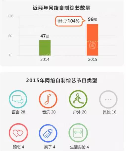 我们看到,2015年在传统电视综艺节目火爆的同时,以《奇葩说》、《爱上超模》、《偶滴歌神啊》、《我去上学啦》、《流行之王》等为代表的顶级纯网综艺节目快速崛起。2015年全行业共有96部网络自制综艺节目,相对2014年增加了104%,其中语言类28个,音乐和户外各20个。《奇葩说》可谓视频网站自制综艺节目的鼻祖,以马东为主,兼有蔡康永、金星、高晓松主持,在2015年可谓火了,视频点播量轻松破亿,同时也吸引来了众多广告主,可谓名利双收。除了那些在行业里面已经名声大噪的纯网综艺外,2016年爱奇艺开发的新节目也吸引了大量广告主的眼球,未播先火,包括包括《十三亿分贝》、《女神买买买》、《晚安朋友圈》、《你是我的菜,就酱》等等。除爱奇艺外,搜狐视频、合一集团、腾讯视频等高管都纷纷表示:2016年将加大扶持视频原创节目的力度。