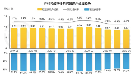 根据QuestMobile的统计,截止2020年6月,短视频市场份额接近20%,成为仅次于即时通讯的第二大行业,而在线视频仅战7.2%。且在线视频行业月活跃用户规模从2019年6月9.31亿,连连下滑至2020年6月的8.57亿。