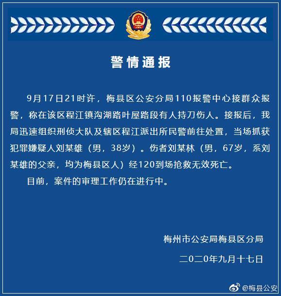 广东省梅州市梅县公安局网络问政平台微博消息,9月17日21时许,梅县区公安分局110报警中心接群众报警,称在该区程江镇沟湖路叶屋路段有人持刀伤人。接报后,梅县公安局迅速组织刑侦大队及辖区程江派出所民警前往处置,当场抓获犯罪嫌疑人刘某雄(男,38岁)。伤者刘某林(男,67岁,系刘某雄的父亲,均为梅县区人)经120到场抢救无效死亡。
