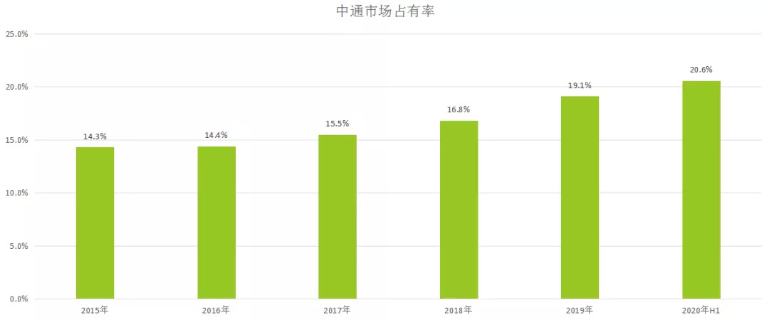 数据是最客观的证据,在2011年中通快递的市场份额仅为7.6%;但到2015年,这一数据几乎翻倍,达到14.3%;今年上半年,中通快递的市场份额更是首次超过20%。