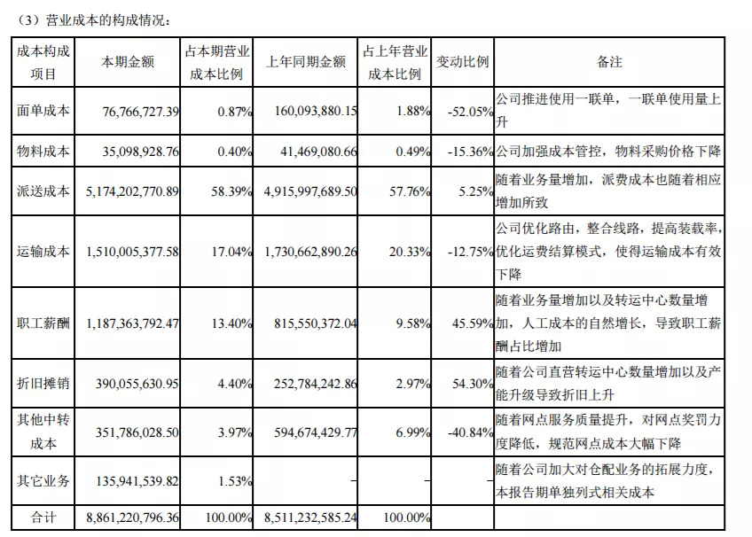 具体而言,快递行业的营业成本主要由派送成本、运输成本、中转站职工薪酬等几部分组成。以申通快递2020年中报为例,派送成本在总营收成本中的占比达到58.39%,运输成本和职工薪酬则分别占比17.04%和13.4%,三项成本合计占总营收成本的88.83%。