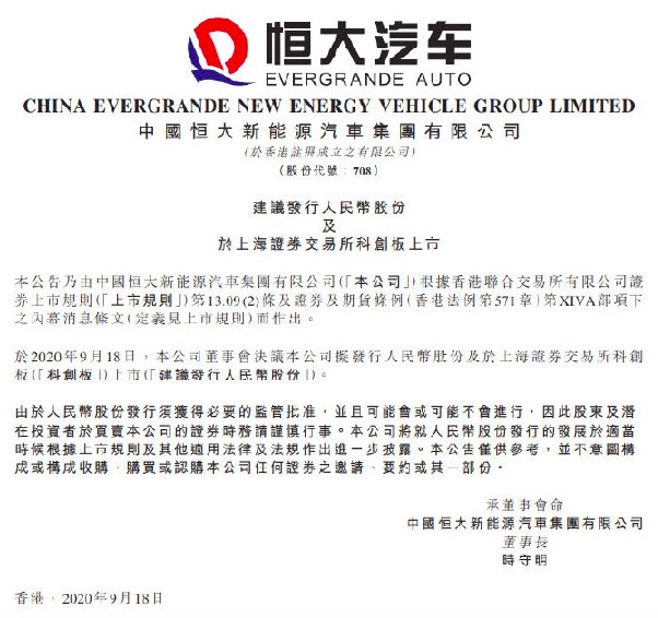 9月18日,恒大汽车在港发布公告称,建议发行人民币股份及于上海证券交易所科创板上市。