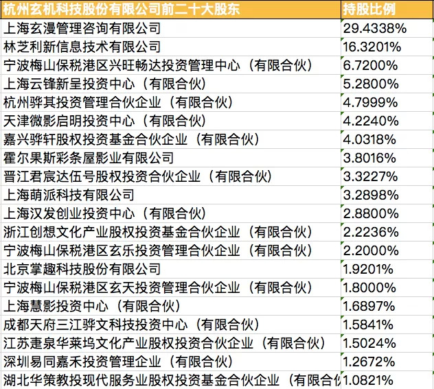 目前,玄机科技投资方中,腾讯旗下林芝利新信息技术有限公司持股16.32%是第二大股东,阿里巴巴创始人马云联合创办的云锋基金旗下上海云峰新呈投资中心(有限合伙)持股5.28%为第四大股东,光线传媒旗下霍尔果斯彩条屋影业有限公司持股比例3.8%为第八大股东,B站旗下上海萌派科技有限公司持股比例3.29%为第十大股东。