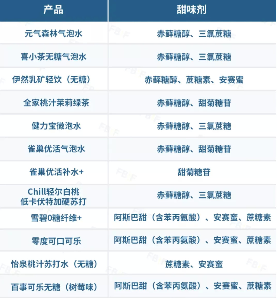 部分无糖饮品使用的甜味剂,图源FBIF食品饮料创新