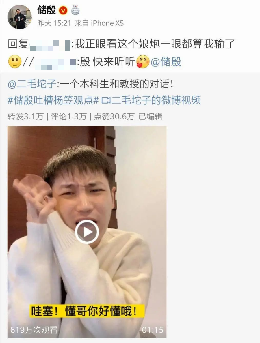 同日,储殷连发数条回应杨笠的回应,其中还夹了一条对一个反击他的“吐槽”视频的人身攻击。