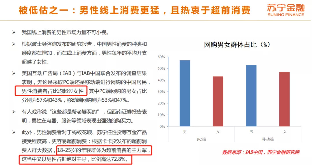今年4月苏宁金融研究院发布的《男性群体消费趋势研究报告》显示,男性更热衷超前消费。