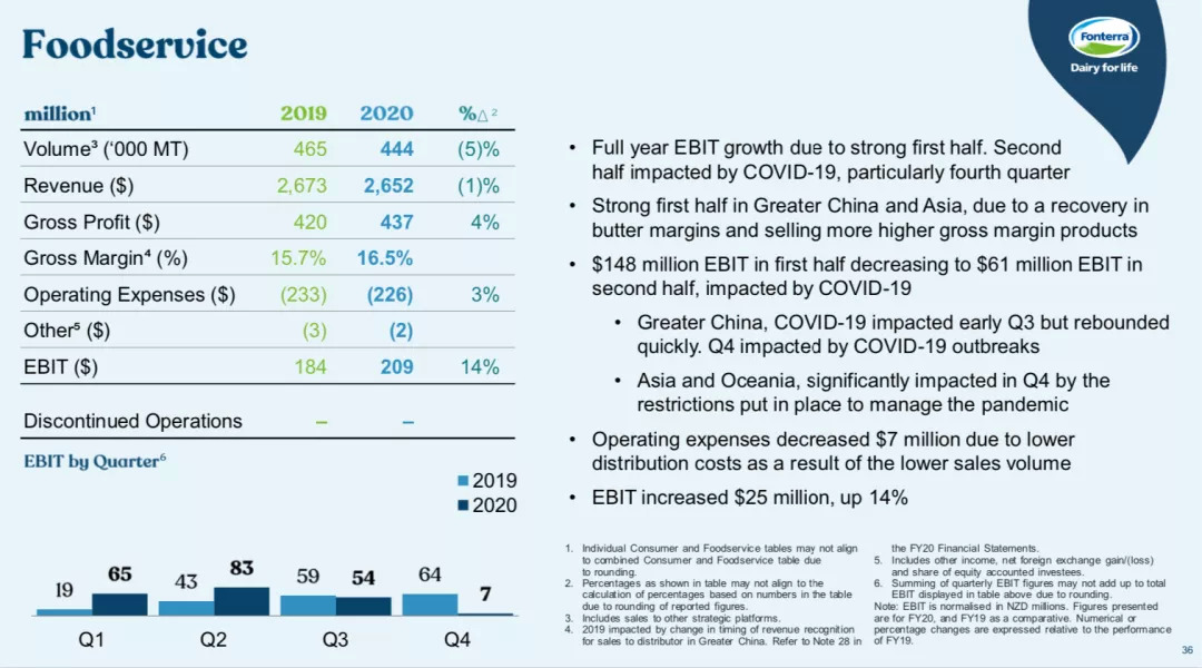 Hurrell表示,恒天然在亚洲、大洋洲和拉丁美洲的餐饮服务业务在第四季度受到了新冠疫情的影响,三个市场均在下半财年出现亏损。尽管如此,2020财年该公司餐饮服务业务的调整后息税前利润仍较上一财年增长了14%,达到2.09亿纽元,“这归功于大中华区业务上半财年的强劲表现”。