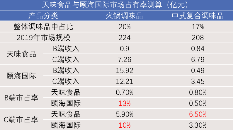 对比2019年天味食品及颐海国际的数据可以看出,2019年天味食品在C端市场较为有优势,C端火锅调味料和中式复合调味料市占率分别约为5.9%、6.5%。而颐海国际依托海底捞在火锅调味料B端市场优势相对明显,市场占有率约为13.0%,火锅调味料C端市占率约为10%。