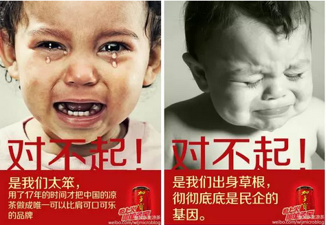 两年前加多宝就抓住了群体的“仇富”心理,用一组海报向王老吉和观众示弱示弱再示弱, 在第一时间赢得了不分青红皂白的情绪声援。