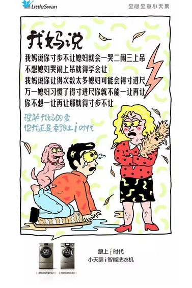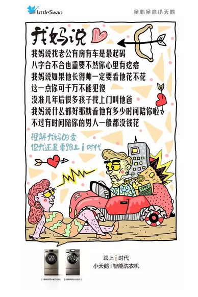 后来,不少传统企业也积极加入,比如去年5月,陈绍团团长给小天鹅做的“我妈说”转型战役,为了取悦年轻的心态、价值观和气质,做了这样一套社会化海报和视频,上气不接下气的文案和夸张的画面,让“说”变得更有情绪,实则表达对“我妈”又烦又爱的心理。