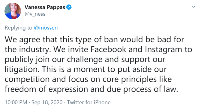 9月18日消息,TikTok临时负责人、美国总经理瓦妮莎·帕帕斯(Vanessa Pappas)在推特上发文称:“我们同意这种类型的禁令对行业不利。我们邀请Facebook和Instagram公开加入我们的挑战,支持我们的诉讼。这是一个搁置我们之间的竞争,专注于言论自由和正当法律程序等核心原则的时刻。”