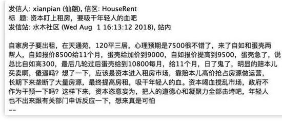 2018年9月,一位自称是北京天通苑房东的人在房地产论坛水木社区里发布了一篇标题为《资本盯上租房,要吸干年轻人的血》的帖子,并掀起了一阵关于房租涨价的全民大讨论。