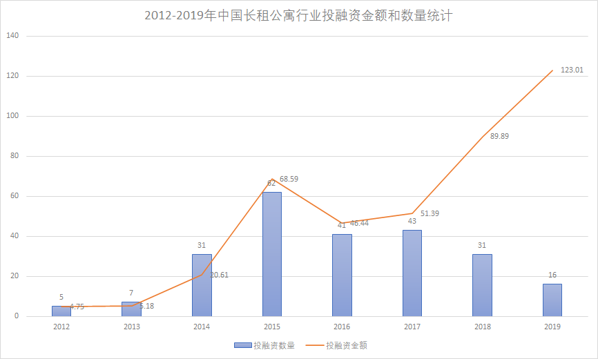 但是,风口虽然过去,资本却并没有放弃多年投入的打算。相反,在2019年,长租公寓仍然以123.01亿人民币的融资额再创历史新高,成为过去8年以来融资数额最大的年份。