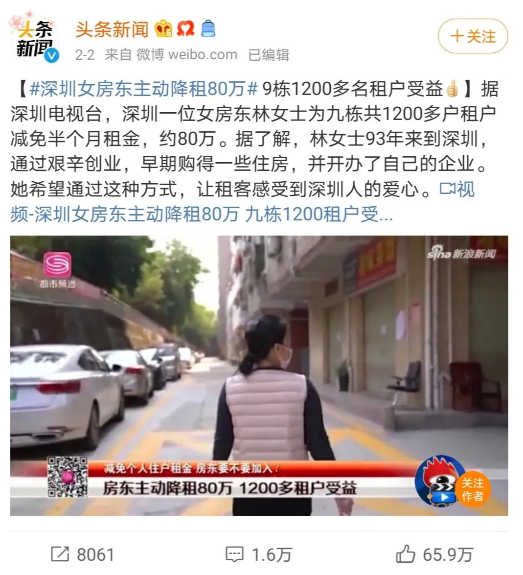 2020年2月2日,据深圳当地媒体报道,深圳房东林女士主动降低半个月房租,合计减免80万,1200多租户受益。此后,相关话题登上微博热搜,累计阅读2.4亿。由此,许多身在外地,受疫情影响无法及时返程的租客也纷纷要求减免房租。