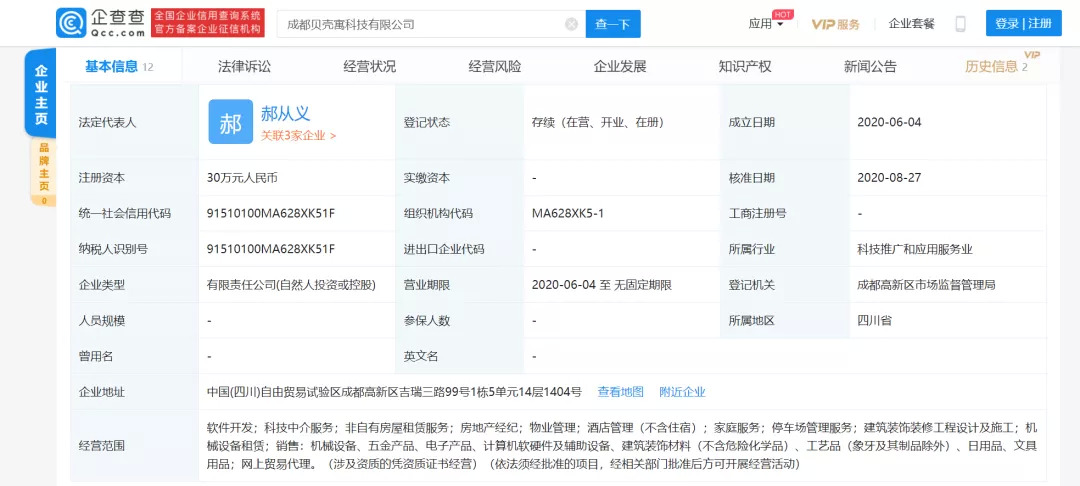 而据企查查显示,这家名叫成都贝壳寓科技有限公司的企业,注册资本仅仅只有30万。