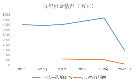 其中,北京大兴缤纷城2019年出租面积约为6.56万平方米,租金收入为4681.37万元;扬州缤纷城2019年出租面积约为2.63万平方米,租金收入为518.49万元。