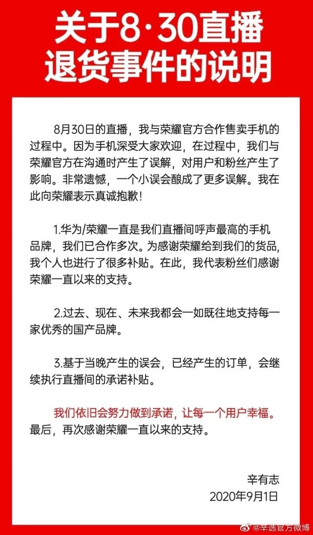 8月30日,快手头部主播辛巴上了热搜,当晚辛巴带货荣耀手机,每款降价300元,他临时要求荣耀多赠送一副耳机,荣耀拒绝。辛巴称,“我亏了4000万交你这个品牌都没交下,不好意思我不交了。”不少网友支持荣耀,认为大公司有自己的审批流程。9月1日,辛巴发文道歉,称己方只是与荣耀官方沟通时“产生了误解”。