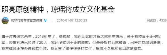 今天中午,琼瑶通过@花非花雾非雾官方微博 发表长微博《照亮原创精神,琼瑶将成立文化基金》,文章开篇便隐晦地将于正批判了一番:“关于我控告于正侵权案,终审判决已经过了20天,我还没收到于正的道歉。”
