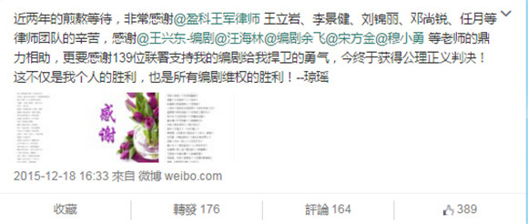 这个案持续了一年半,中间更有于正暗讽琼瑶江郎才尽、139名编剧联名支持琼瑶维权等等事件穿插其中。在二审判决刚刚下达的时候,琼瑶不禁激动发声:“今终于获得公理正义判决!这不仅是我个人的胜利,也是所有编剧维权的胜利!”“这是一次历史性、标竿性的宣判,对保护原创,意义深远而伟大!”不过,如今判决过去20天了,于正方面还是毫无表示,从2015年拖到2016年,于正打算拖到什么时候呢?