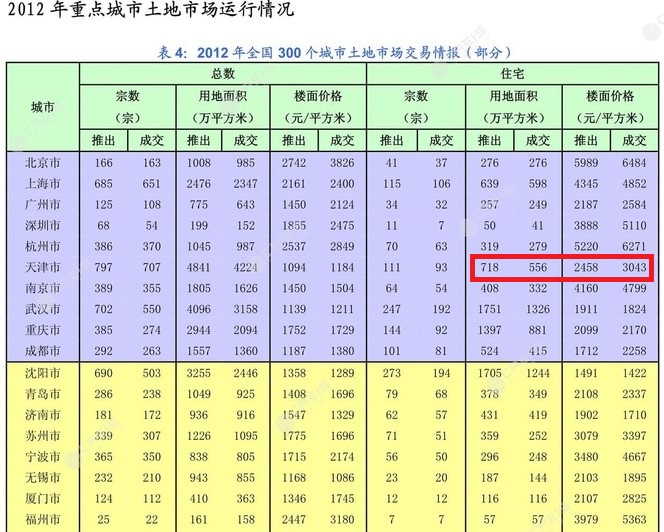2012年,即便是这个口径,天津城区的宅地供应也是全国第三,只比武汉、重庆低。最终实际成交556万平米,成交均价3043元/平米,推出均价是2458元/平米,溢价率还不错。