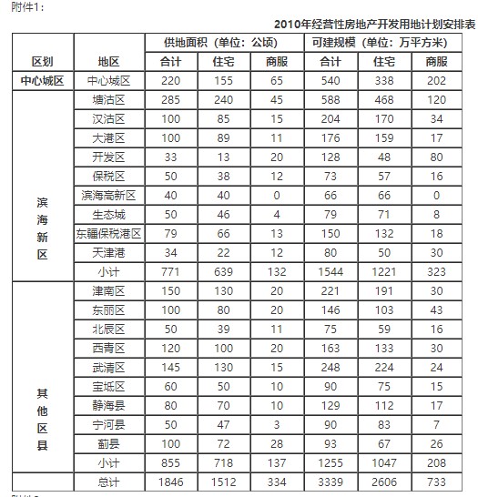2010年,天津全市计划供应商品住宅用地1512公顷、建筑规模2606万平米。分区域来说,中心城区计划供应商品住宅用地155公顷、建筑规模338万平方米(含限价商品房用地68公顷、150万平方米);滨海新区计划供应商品住宅用地639公顷、建筑规模1220万平方米(含限价商品房用地67公顷、141万平方米);其它区县计划供应商品住宅用地718公顷、建筑规模1048万平方米。