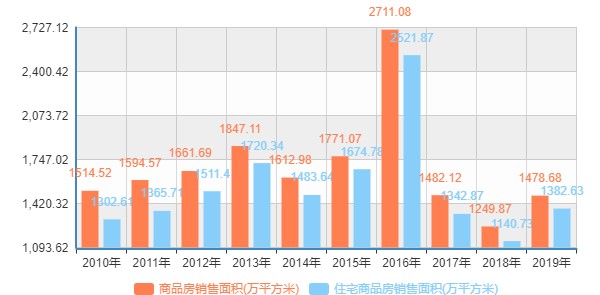 我们发现2010年-2013年,无论整个商品房还是商品住宅销售面积,当时一路都在增长。阶段性顶峰时2013年商品房销售面积超过1800万平米,商品住宅超过1700万平米。