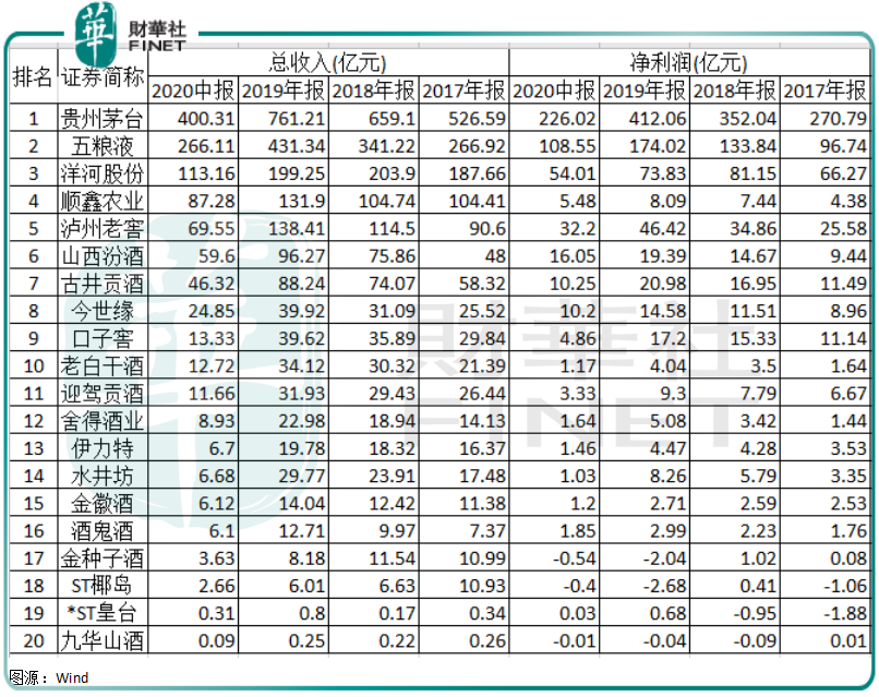 Wind数据显示,根据2019年营收和2020年上半年营收看,舍得酒业在20家A股上市同业公司中排名在12位。