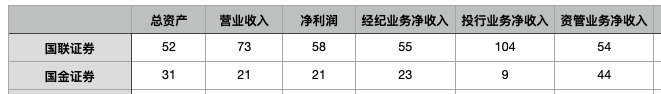 根据证券业协会披露的上半年排名数据,除了资产规模外,国金证券在几项重要业务排名上也都领先于国联证券,尤其是投行业务方面,更是具备明显的优势。
