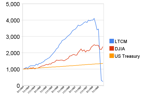投资1000美元在长期资本管理基金(LTCM)、道琼斯工业指数(DJIA)和美国国债(US Treasury)时的净值比较