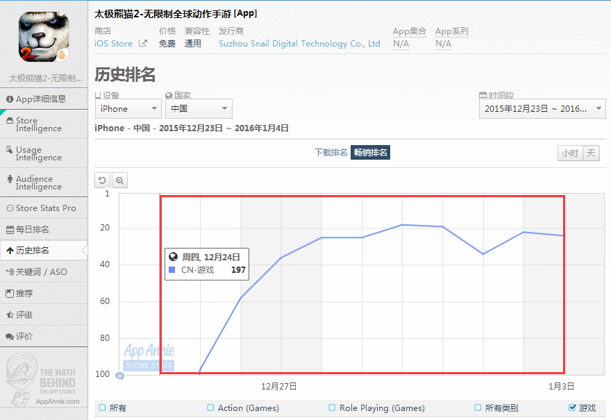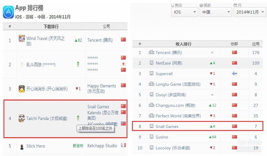 不久前,蜗牛推出《太极熊猫》续作《太极熊猫2》,前作《太极熊猫》毫无疑问是蜗牛2014年9月推出的爆款,14年11月进入IOS国内下载榜第四名,同时蜗牛凭借该产品跃升4级跻身于IOS中国厂商收入榜第8,目前运营时间超过15个月,整体成绩一直在畅销榜前35名以上。