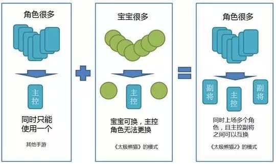 在手游重度化的道路上,其《太极熊猫》则走得更远,多角色切换玩法直接舍弃了“职业”与“宝宝”体系,更是把职业互通发挥到极致,玩家可以从角色池中任意培养、自由选择主、副角色,组成一个队伍。从而保证了在手游端不加深游戏操作的复杂性的情况下,加强其玩法的策略性 极大适应了手游玩家重度化的需求。