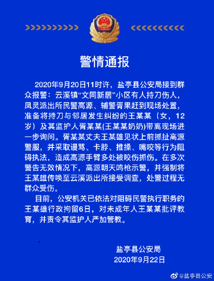据四川省绵阳市盐亭县公安局官方微博通报,9月20日11时许,盐亭县公安局接到群众报警:云溪镇“文同新居”小区有人持刀伤人,凤灵派出所民警高源、辅警胥果赶到现场处置,准备将持刀与邻居发生纠纷的王某某(女,12岁)及其监护人胥某某(王某某奶奶)带离现场进一步询问。胥某某丈夫王某雄见状上前抓扯高源警服,并采取谩骂、卡脖、推搡、嘴咬等行为阻碍执法,造成高源手臂多处被咬伤抓伤。